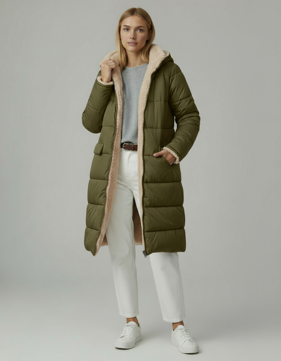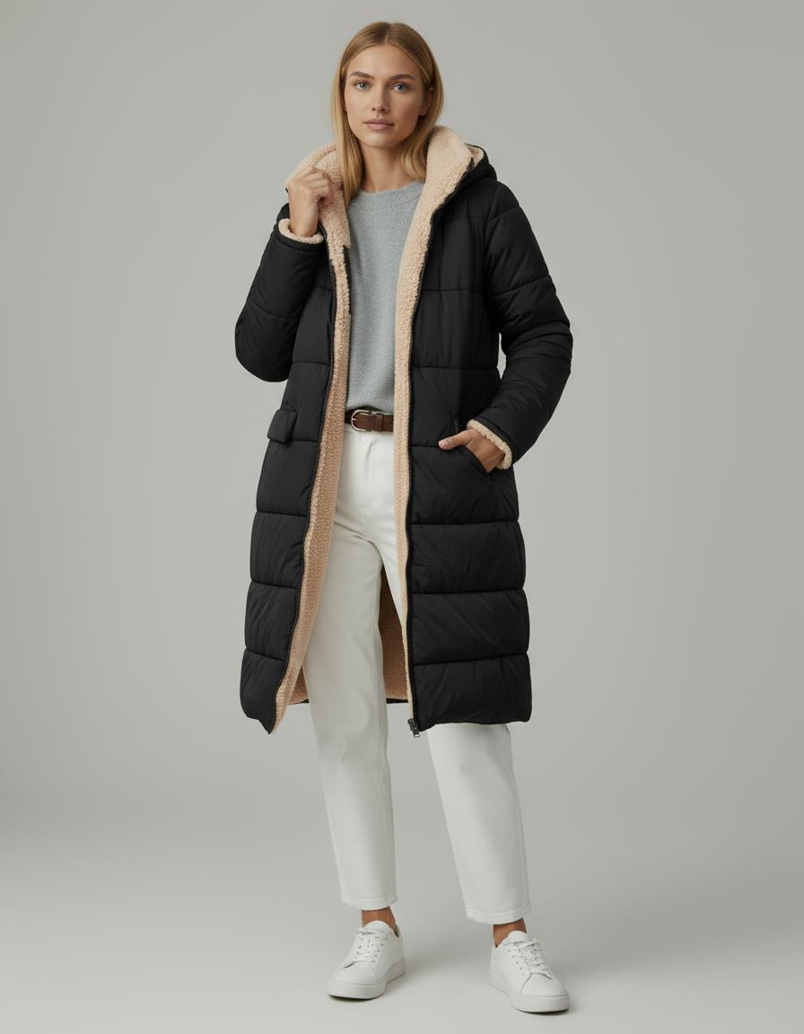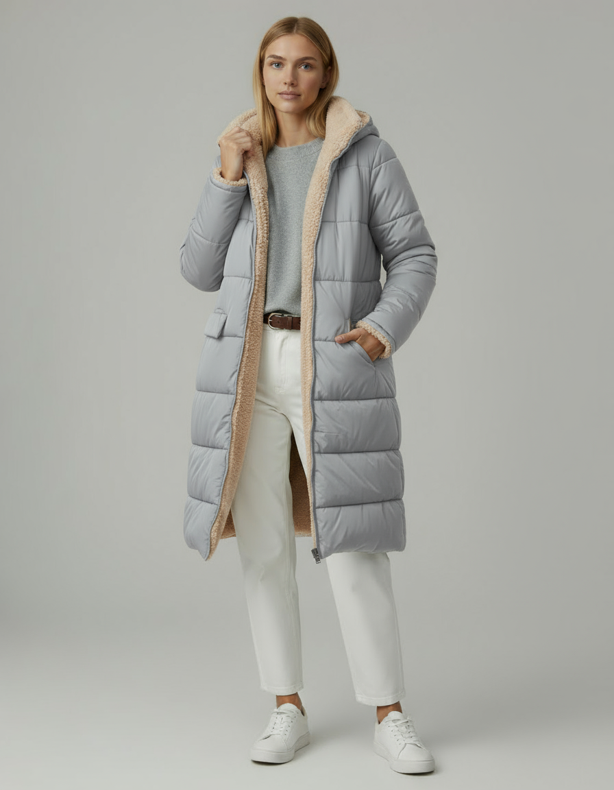 Damska długa kurtka pikowana z kapturem | Zimowa