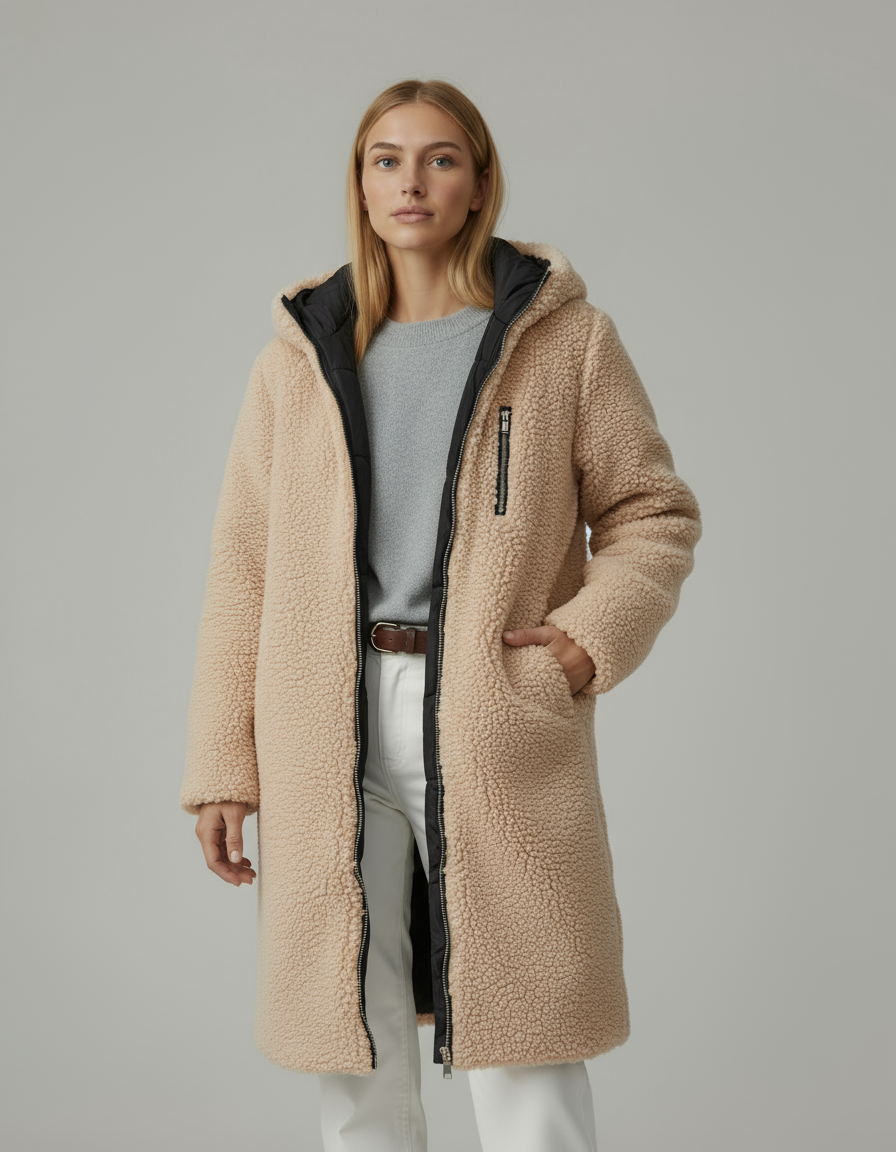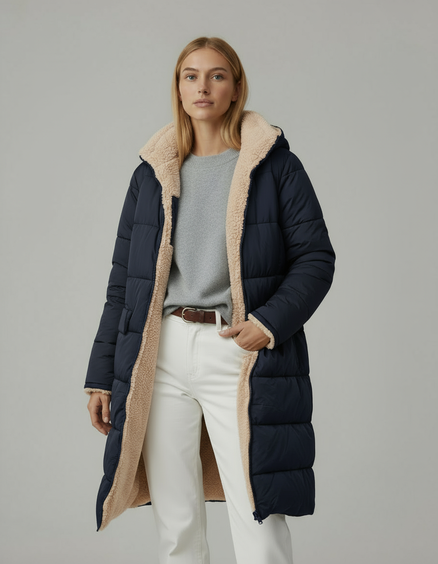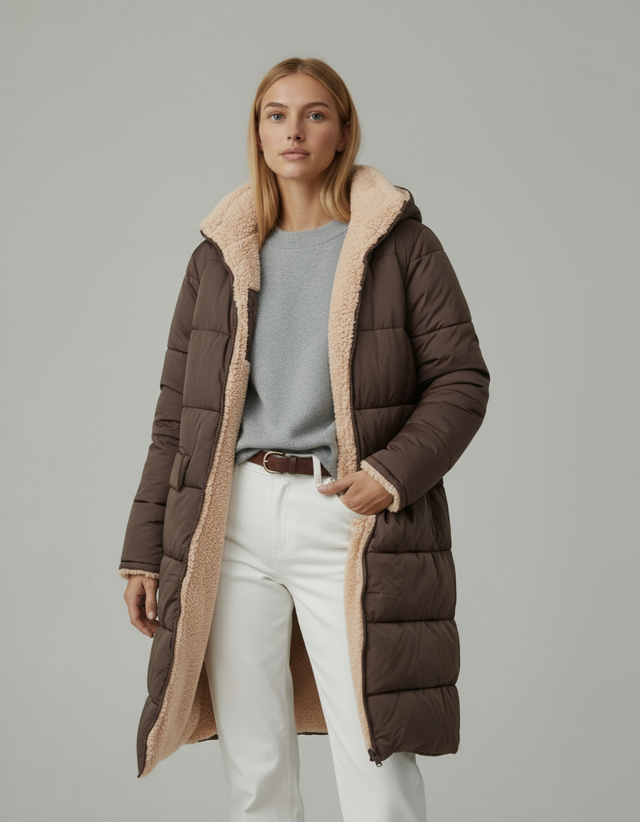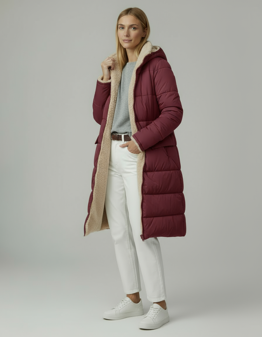 Damska długa kurtka pikowana z kapturem | Zimowa