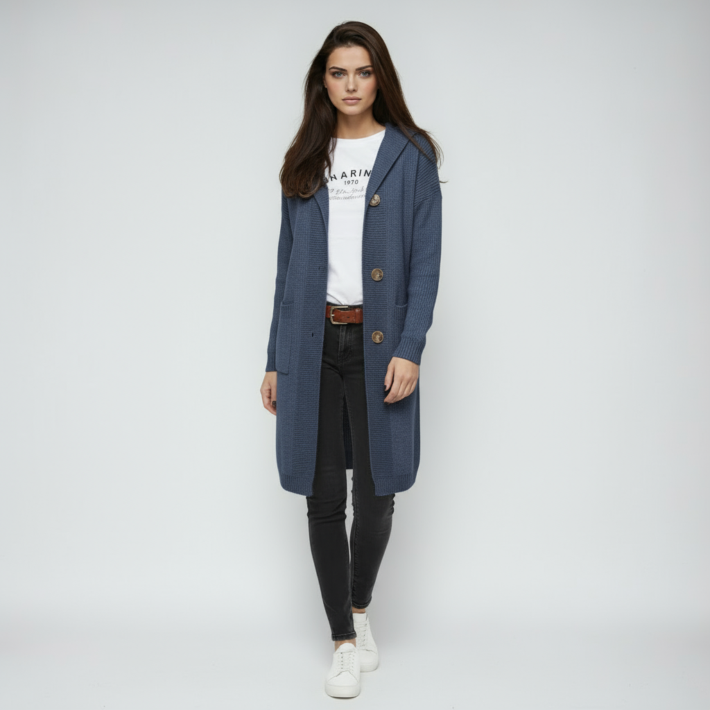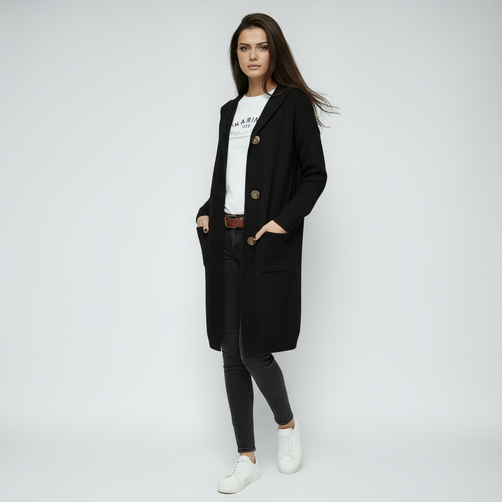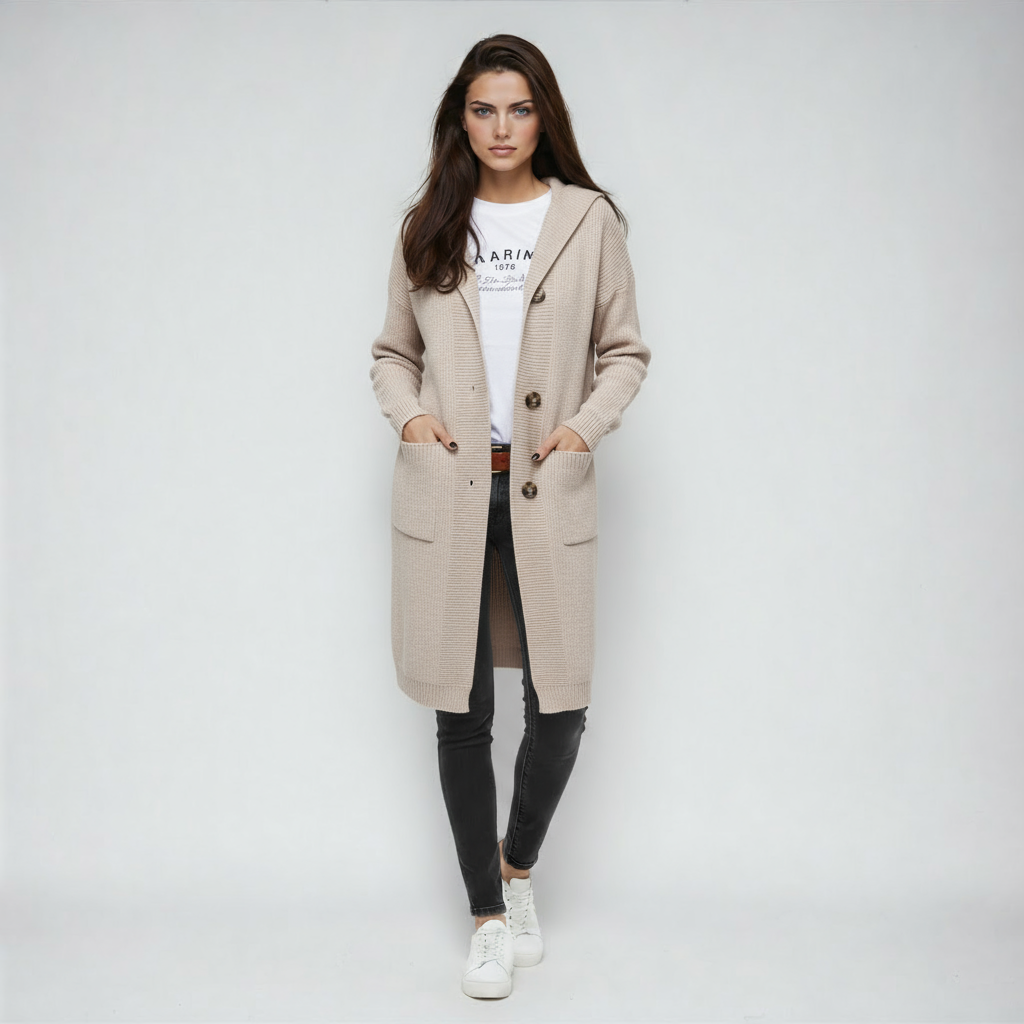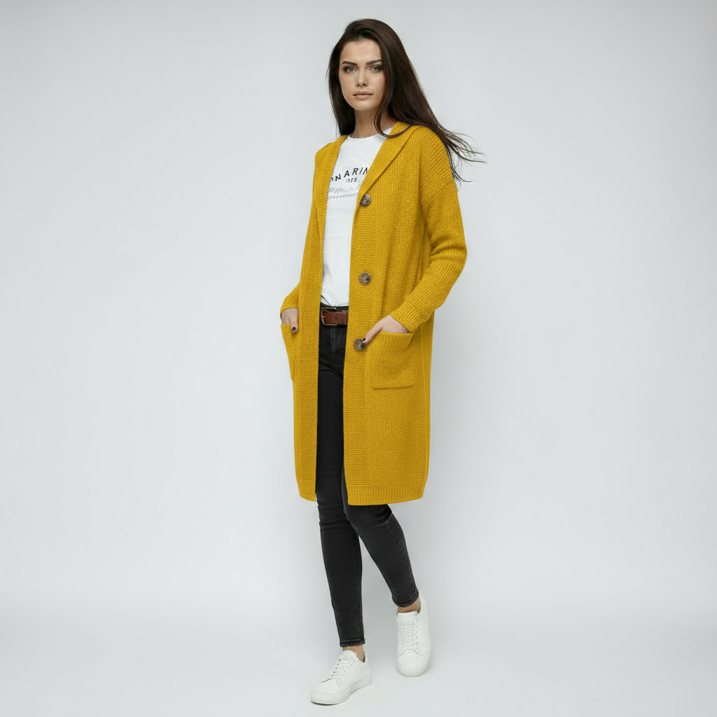 Damska Długi Kardigan z Guzikami | Z Kapturem