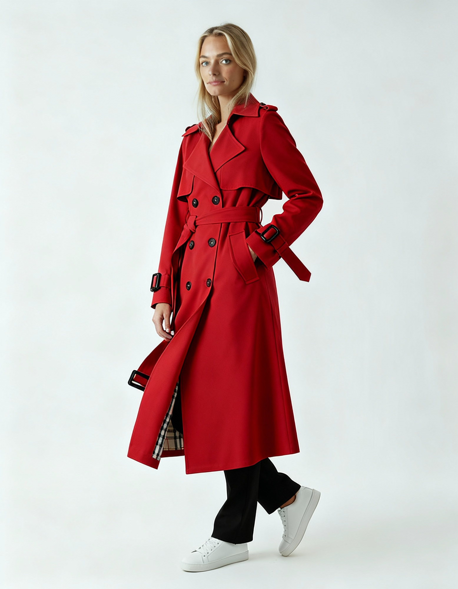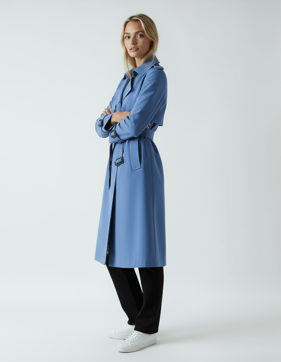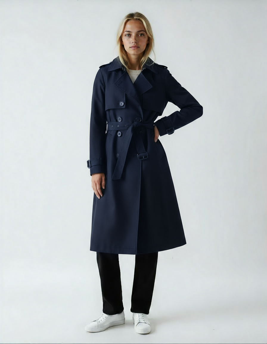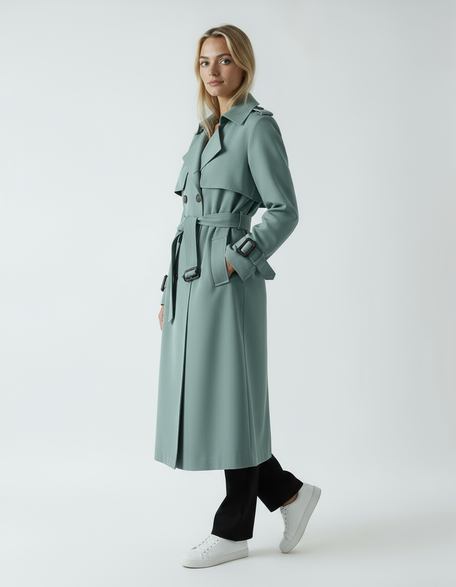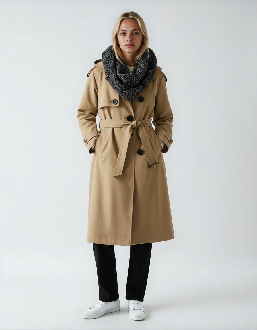 Płaszcz damski trench beżowy | Długa prosta kurtka z paskiem i klapami
