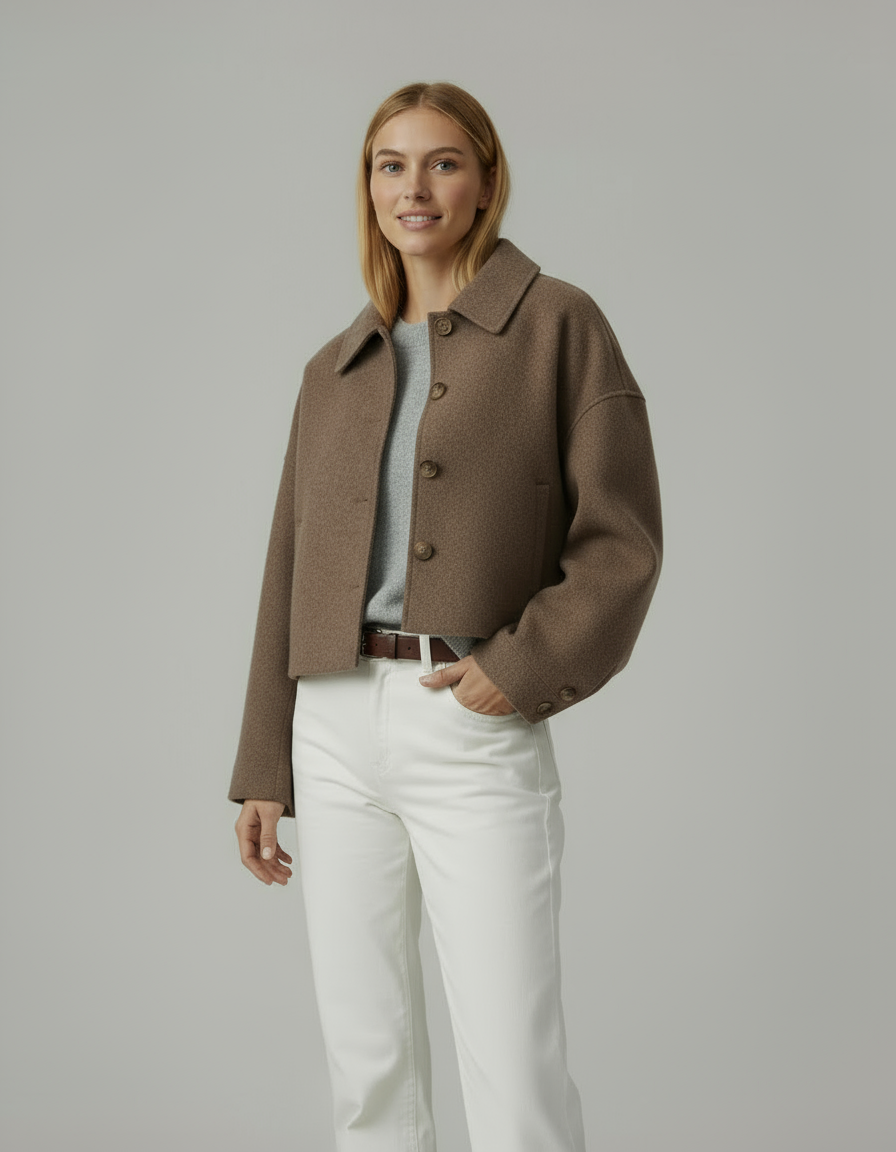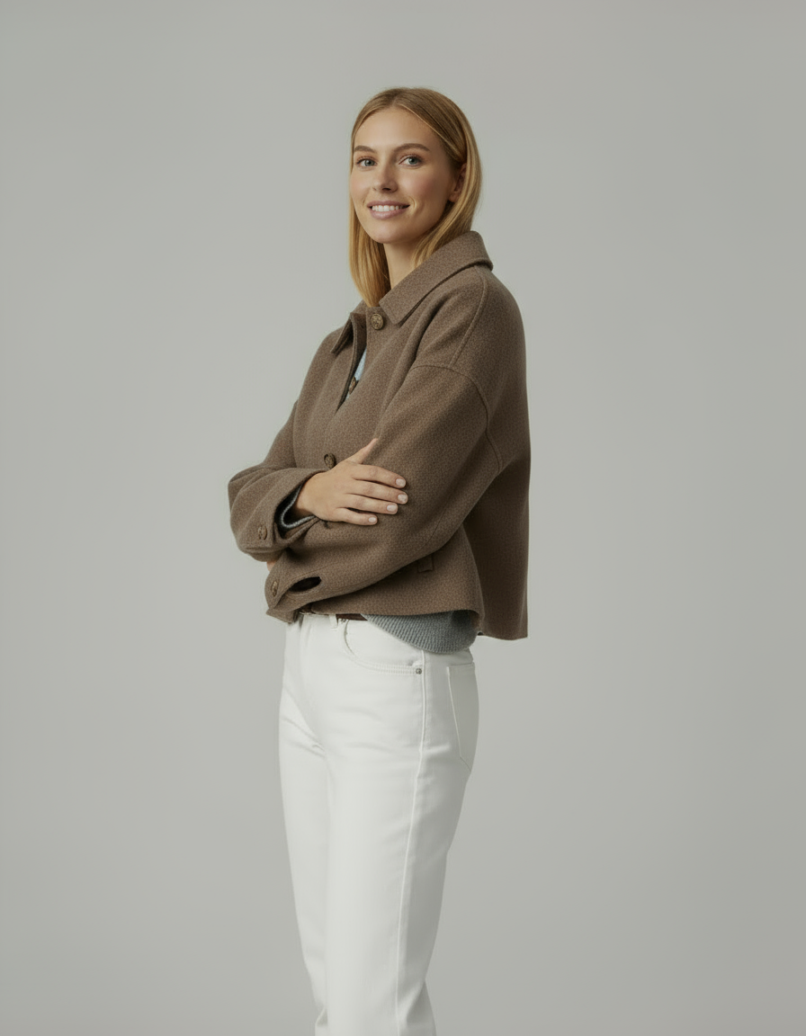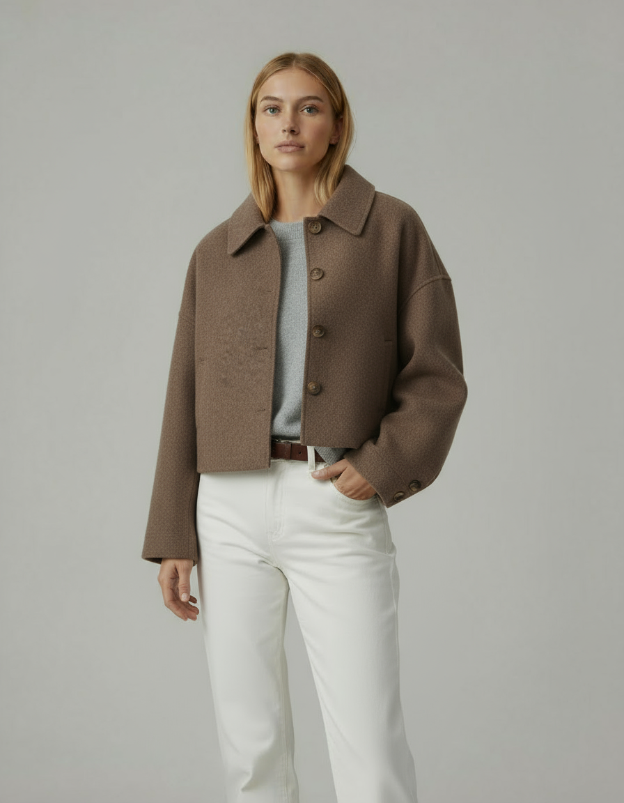 Kurtka damska wełniana krótka | Brązowy płaszcz z kołnierzem i guzikami
